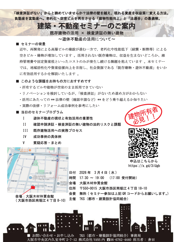 ◎【TKS建築・不動産セミナーのご案内】 所属する設計協同組合で、遊休不動産の活用をテーマとしたセミナーを開催します。検査済証がない既存建築物をいかに合法的に活用するかについて、整理してお話しします。 とはいえ、検査済証 …[…続きを読む]