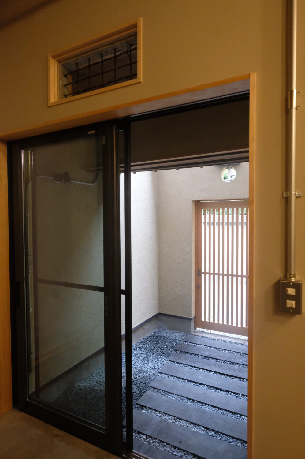 BEFORE 外観 BEFORE 1F内観 BEFORE 2F内観 減築して再生した前庭 入口はガラス戸として、土間空間から前庭の空間を取り込んでいます。