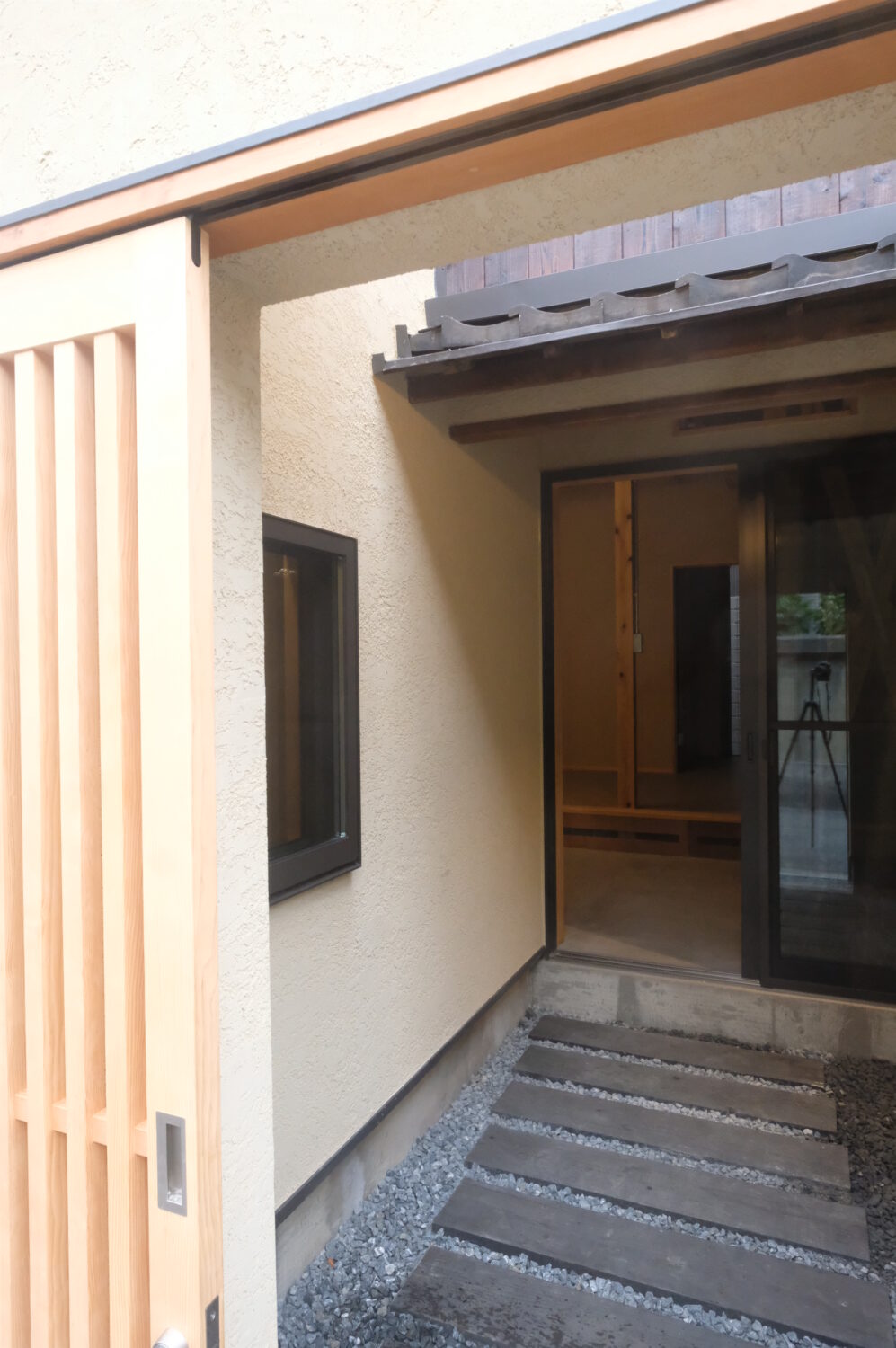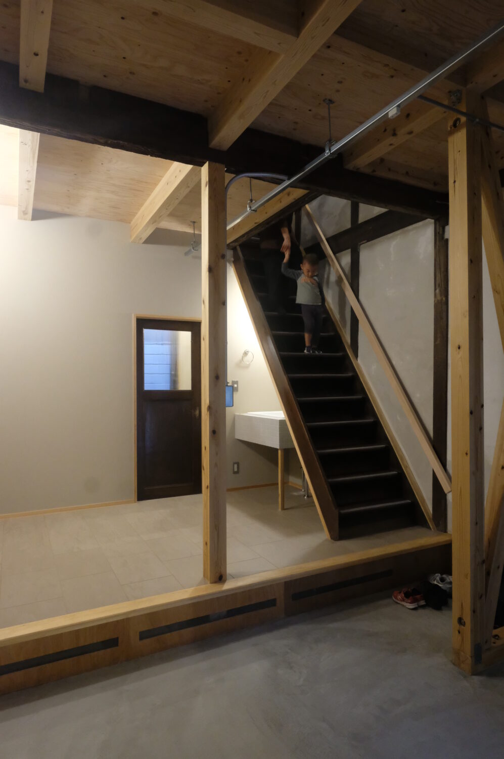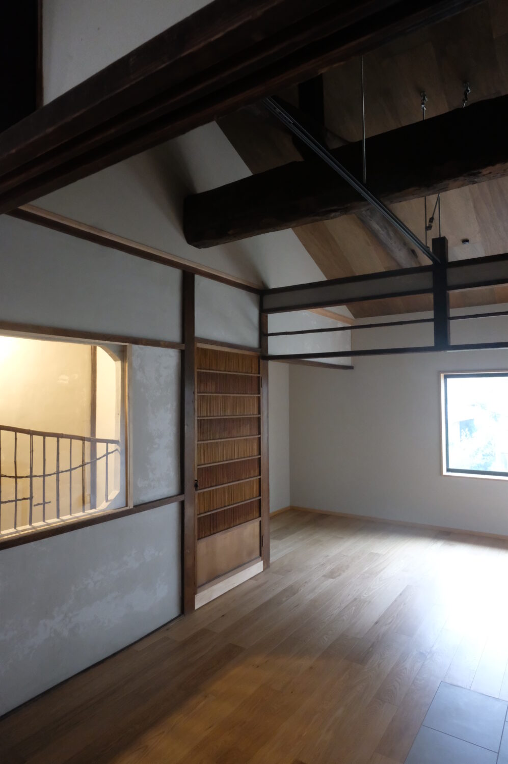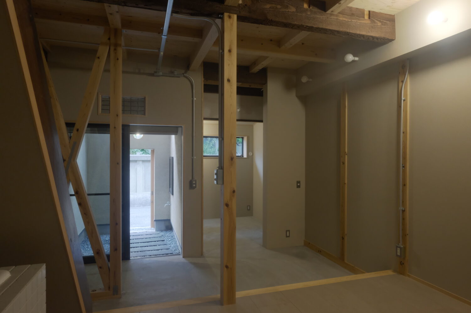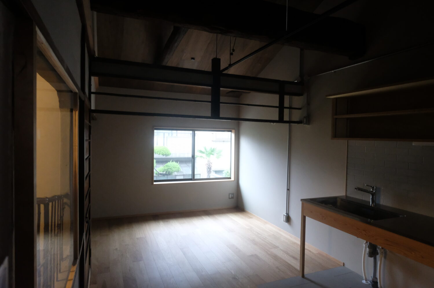 帝塚山1丁目の4軒長屋の20数年来空き家だった一区画をリノベーションしました。現地調査すると、建設時にはあったであろう前庭や後庭にも増築がされ、見通しもなく、光も入りづらい住まいになっていました。小さな長屋ですが、住環境を整えるために減築をして庭をしっかり再生することを提案しました。減築しても外部空間を内部にも取り込めるよう、土間空間を半分ほど計画。狭さも感じない工夫もしました。そこは小商いのアトリエや物販店なども可能なスペース。階段を上がると続き間をワンルームにしたリビング空間、2階は立派な梁を現しにして、高天井のおおらかな空間になりました。そこには造作キッチンを備え、入居者さんにアレンジを楽しんでもらえます。コンパクトでありながら長屋の良さが凝縮されたリノベーションとなりました。